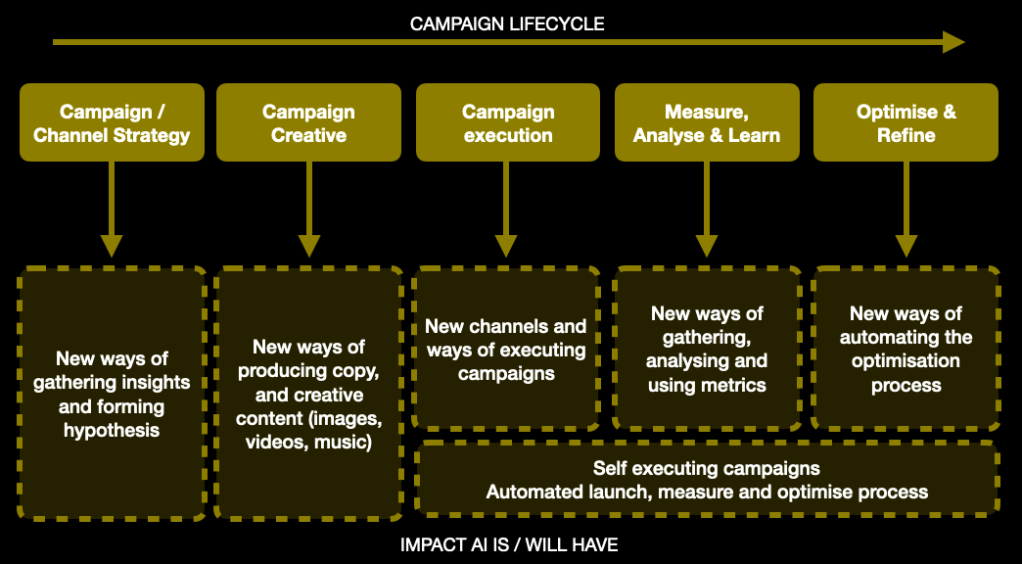 Take a closer look at the lifecycle of a marketing campaign and it’s easy to see how and where new AI is already and soon to be impacting the way agencies and brands work their campaigns.
