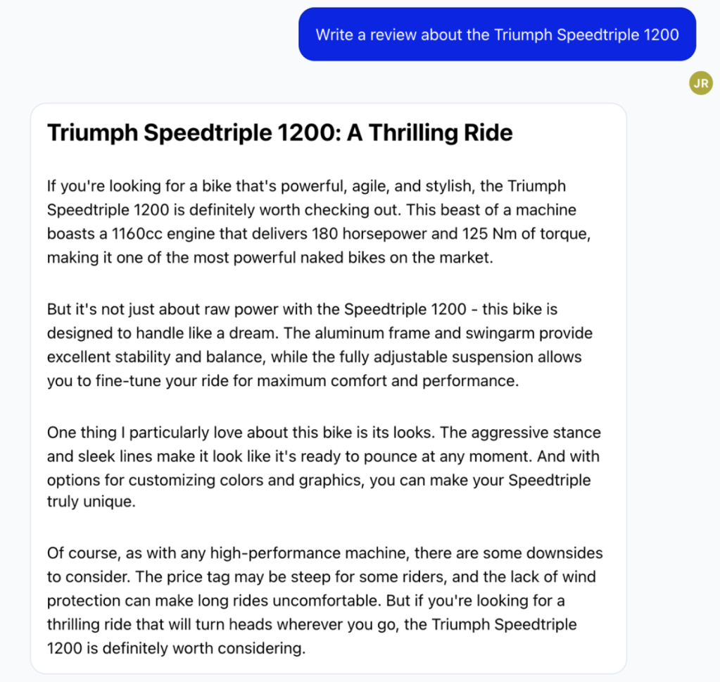 Nope, that’s not me riding my Speed Triple 1200 through the Blue Mountains. It’s a 100% Stable Diffusion created image using the prompt “A Triumph Speedtriple style sports motorcycle racing on a road through the Australian bush at sunset” … but it’s a pretty accurate description of what I do enjoy doing. Which got me thinking about reviews. Could I get AI to write me a good review of my bike?