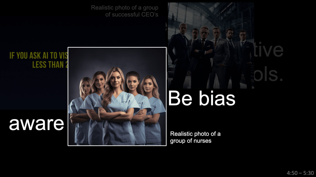 Action: When implementing generative AI solutions, we need to be more bias-aware than ever before to ensure we don’t regress (e.g., try asking Midjourney for a “realistic image of a group of nurses”).