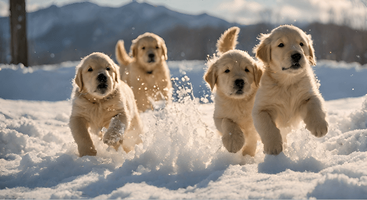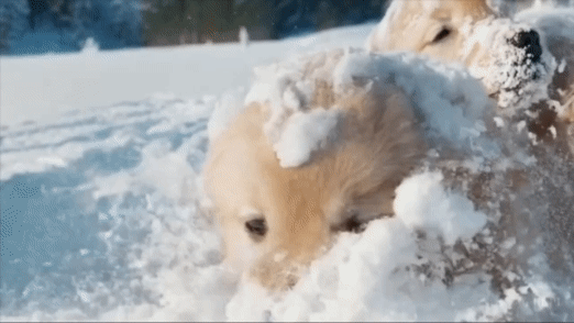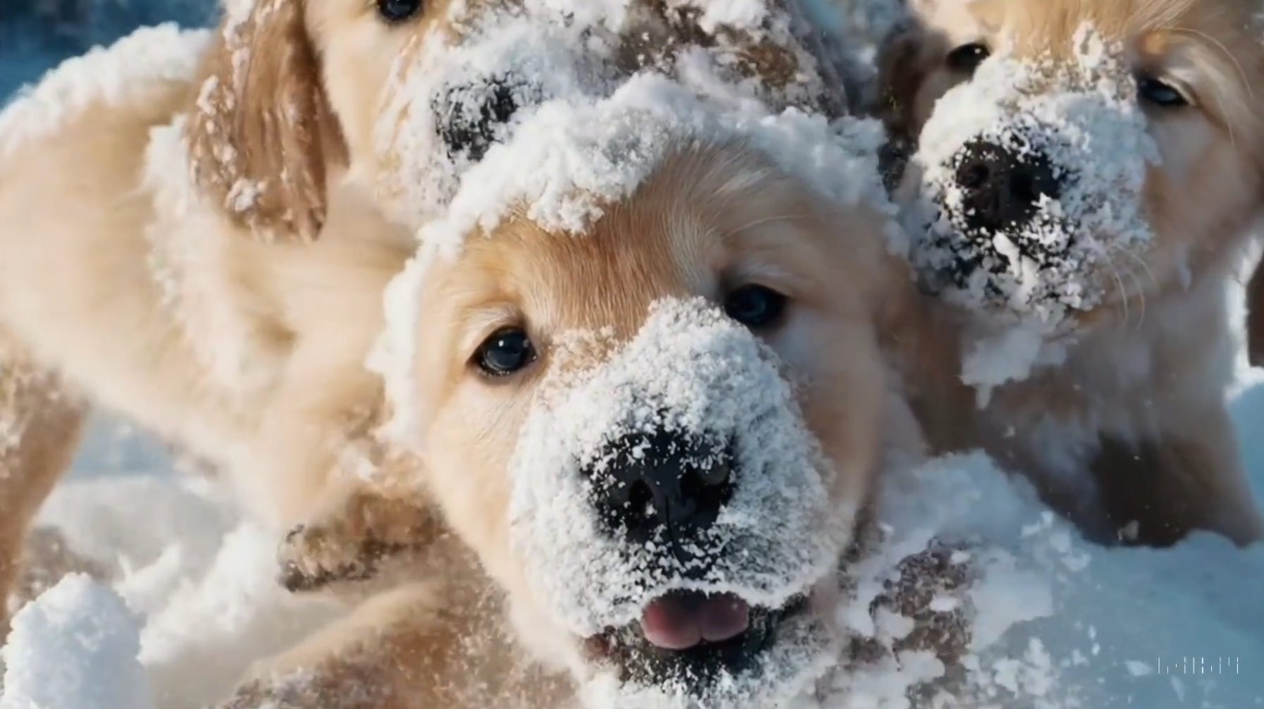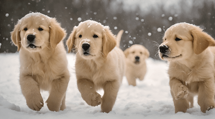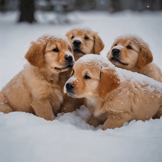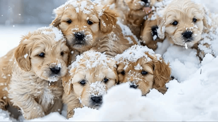 “A litter of golden retriever puppies playing in the snow. Their heads pop out of the snow, covered in snow.”