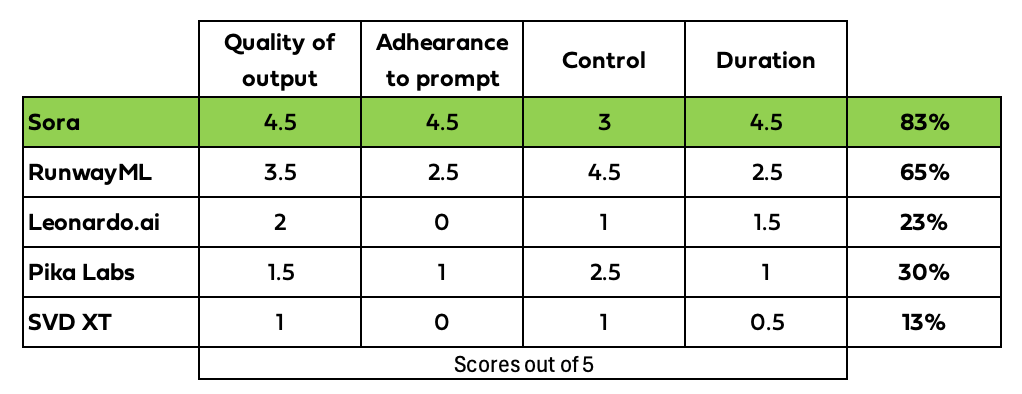 A table with a quick summary of our findings of the various AI video generation tools, with Sora’s amazing puppies taking a clear lead on all measurements.